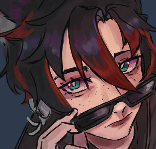 A small-built Miqo'te male who has pale skin. Jade eyes with naturally unkept hair which can be an array of colors, though naturally his hair is jet black with dalamud red tips. A black gem on his forehead in the shape of a teardrop. Light freckles along his cheeks and over his nose, a lot more freckles can be found throughout his body. Normally wearing some sort of collar around his neck, at times with a large cat bell on it.